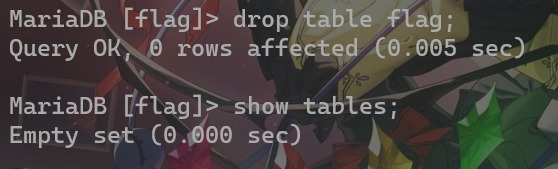 可以看到我们的test数据库内只有一个flag表,下面删除该表drop table flag;