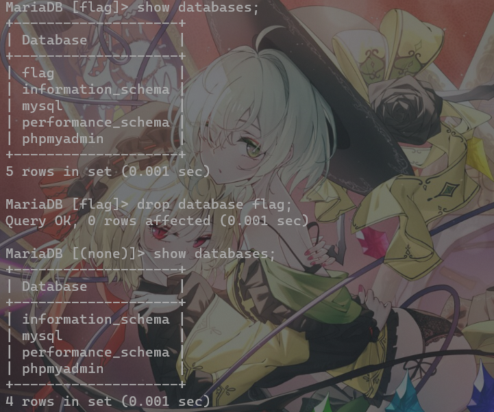 先看一下有哪些数据库 show databases;,之前复现题目环境时创建了个flag数据库,正好可以试下删除数据库的操作