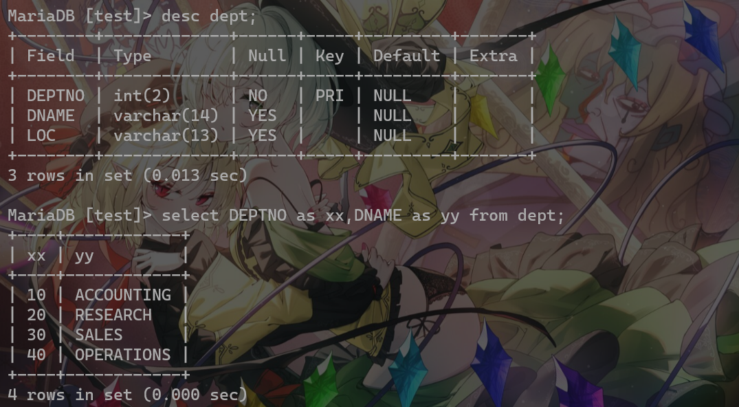 1 2 3 4 5 6 7 8 9 select * from dept; +--------+------------+----------+ | DEPTNO | DNAME | LOC | +--------+------------+----------+ | 10 | ACCOUNTING | NEW YORK | | 20 | RESEARCH | DALLAS | | 30 | SALES | CHICAGO | | 40 | OPERATIONS | BOSTON | +--------+------------+----------+