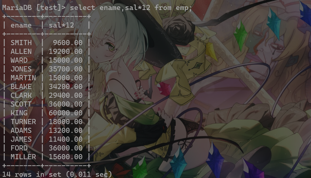 1 2 3 4 5 6 7 8 9 10 11 12 13 14 15 16 17 18 19 select ename,sal + comm as salcomm from emp;#数据库中有null参与的数据运算结果都为null +--------+---------+ | ename | salcomm | +--------+---------+ | SMITH | NULL | | ALLEN | 1900.00 | | WARD | 1750.00 | | JONES | NULL | | MARTIN | 2650.00 | | BLAKE | NULL | | CLARK | NULL | | SCOTT | NULL | | KING | NULL | | TURNER | 1500.00 | | ADAMS | NULL | | JAMES | NULL | | FORD | NULL | | MILLER | NULL | +--------+---------+