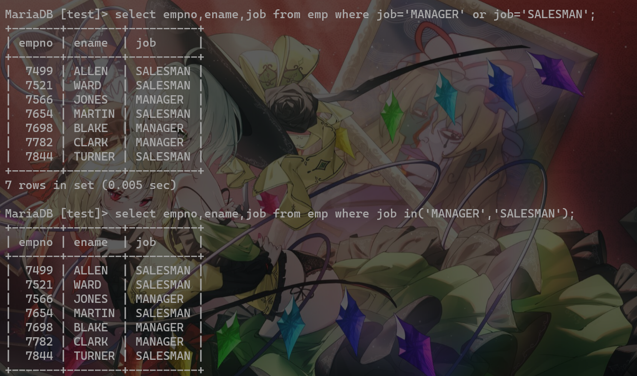1 2 3 4 5 6 7 8 9 10 11 12 13 14 15 16 17 18 19 20 21 22 23 24 25 26 27 28 29 select ename,job from emp where job = 'MANAGER'; +-------+---------+ | ename | job | +-------+---------+ | JONES | MANAGER | | BLAKE | MANAGER | | CLARK | MANAGER | +-------+---------+ select ename,job from emp where job = 'SALESMAN'; +--------+----------+ | ename | job | +--------+----------+ | ALLEN | SALESMAN | | WARD | SALESMAN | | MARTIN | SALESMAN | | TURNER | SALESMAN | +--------+----------+ select ename,job from emp where job = 'MANAGER' union select ename,job from emp where job = 'SALESMAN'; +--------+----------+ | ename | job | +--------+----------+ | JONES | MANAGER | | BLAKE | MANAGER | | CLARK | MANAGER | | ALLEN | SALESMAN | | WARD | SALESMAN | | MARTIN | SALESMAN | | TURNER | SALESMAN | +--------+----------+