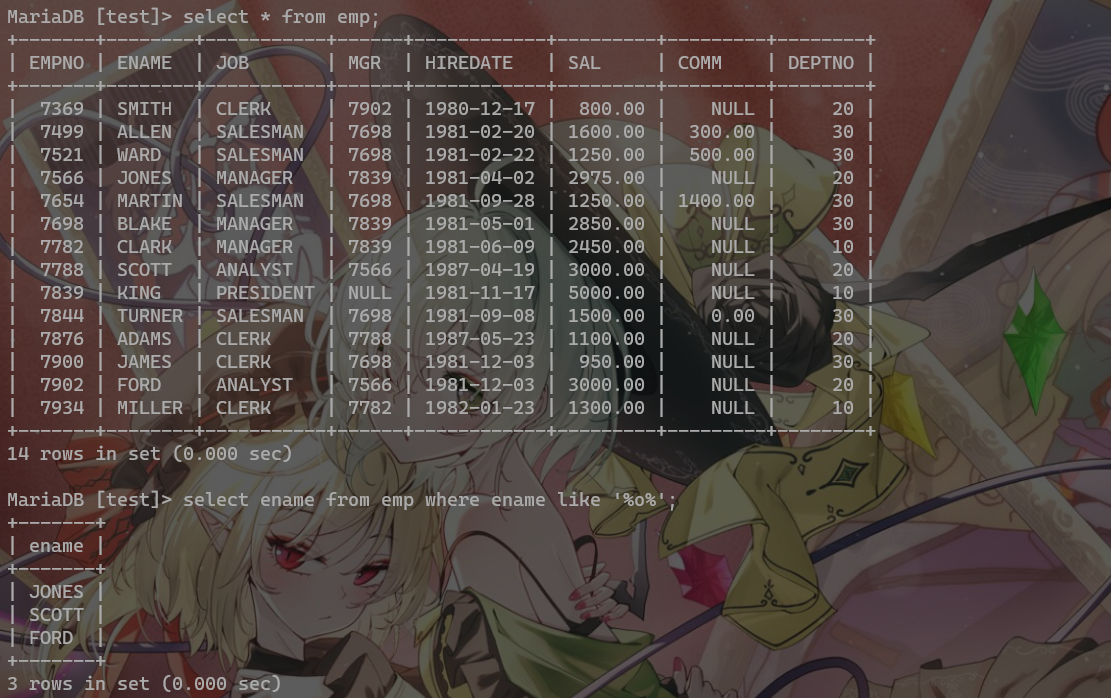 1 2 3 4 5 6 7 8 9 10 11 12 13 14 15 16 17 18 19 select * from emp; +-------+--------+-----------+------+------------+---------+---------+--------+ | EMPNO | ENAME | JOB | MGR | HIREDATE | SAL | COMM | DEPTNO | +-------+--------+-----------+------+------------+---------+---------+--------+ | 7369 | SMITH | CLERK | 7902 | 1980-12-17 | 800.00 | NULL | 20 | | 7499 | ALLEN | SALESMAN | 7698 | 1981-02-20 | 1600.00 | 300.00 | 30 | | 7521 | WARD | SALESMAN | 7698 | 1981-02-22 | 1250.00 | 500.00 | 30 | | 7566 | JONES | MANAGER | 7839 | 1981-04-02 | 2975.00 | NULL | 20 | | 7654 | MARTIN | SALESMAN | 7698 | 1981-09-28 | 1250.00 | 1400.00 | 30 | | 7698 | BLAKE | MANAGER | 7839 | 1981-05-01 | 2850.00 | NULL | 30 | | 7782 | CLARK | MANAGER | 7839 | 1981-06-09 | 2450.00 | NULL | 10 | | 7788 | SCOTT | ANALYST | 7566 | 1987-04-19 | 3000.00 | NULL | 20 | | 7839 | KING | PRESIDENT | NULL | 1981-11-17 | 5000.00 | NULL | 10 | | 7844 | TURNER | SALESMAN | 7698 | 1981-09-08 | 1500.00 | 0.00 | 30 | | 7876 | ADAMS | CLERK | 7788 | 1987-05-23 | 1100.00 | NULL | 20 | | 7900 | JAMES | CLERK | 7698 | 1981-12-03 | 950.00 | NULL | 30 | | 7902 | FORD | ANALYST | 7566 | 1981-12-03 | 3000.00 | NULL | 20 | | 7934 | MILLER | CLERK | 7782 | 1982-01-23 | 1300.00 | NULL | 10 | +-------+--------+-----------+------+------------+---------+---------+--------+