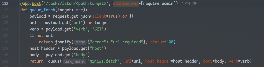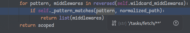 步出,然后继续往下走到self._pattern_matches()函数,这里的匹配表达式是/tasks/fetch/**,如果我们请求一个/tasks/fetch/aaa路由,必然会被匹配到从而返回一个识别require_login的中间件