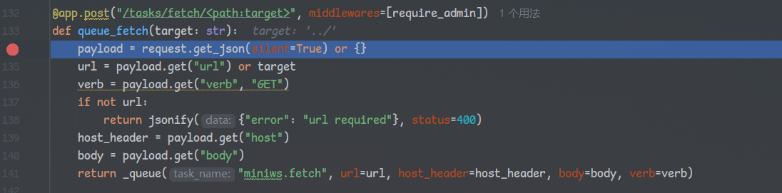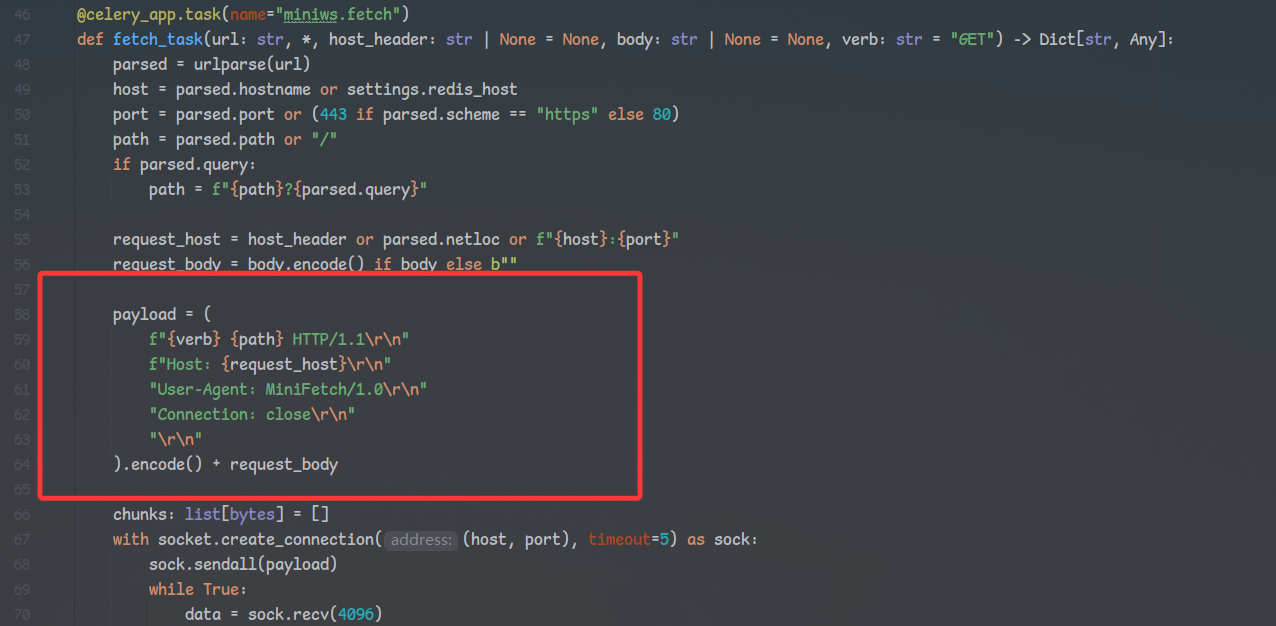 这道题审计源码后,很明显的能够发现在/tasks/fetch/<path:target>下是存在一处SSRF的,乍一看似乎是发起http请求的SSRF,但是后续测试中,以打下redis为目标,猜测可以在verb字段进行一个伪造RESP数据流的包进行攻击,url字段只是提供一个目标ip