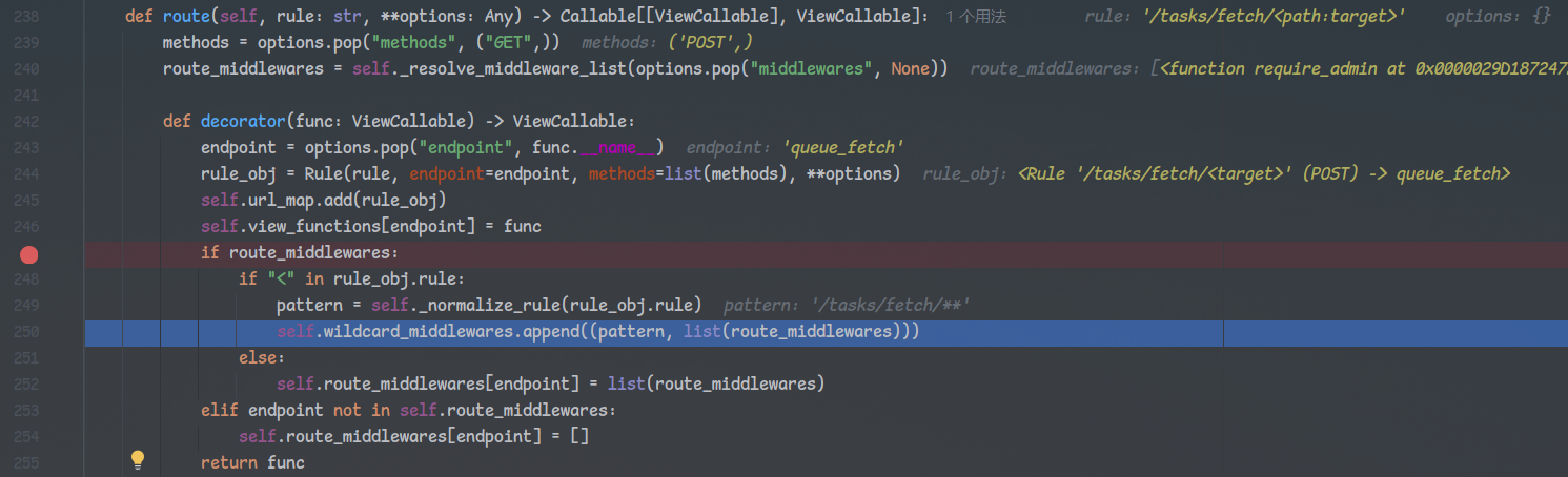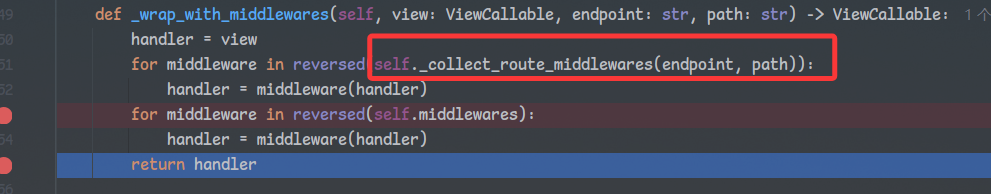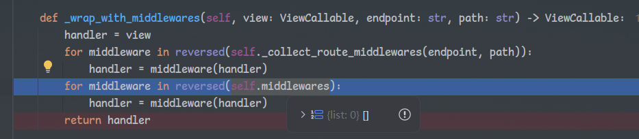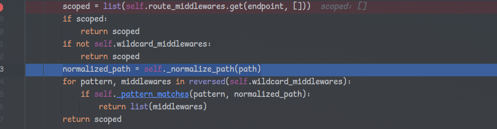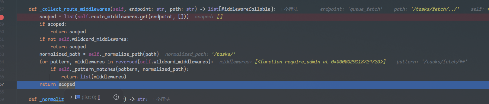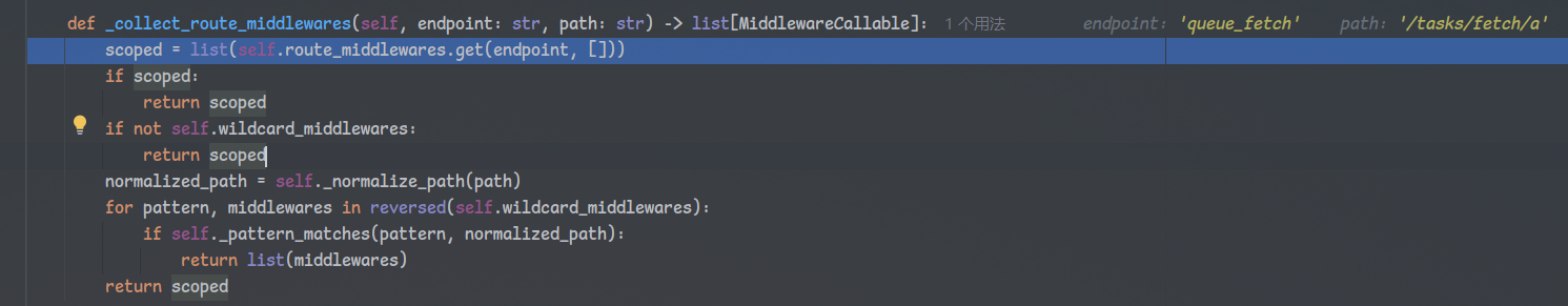 回到上面的_collect_route_middlewares()函数继续分析,上面提到由于queue_fetch不在route_middlewares中,因此scoped为空且self.wildcard_middlewares也被插值了不为空,不提前retuen,而是继续往下走