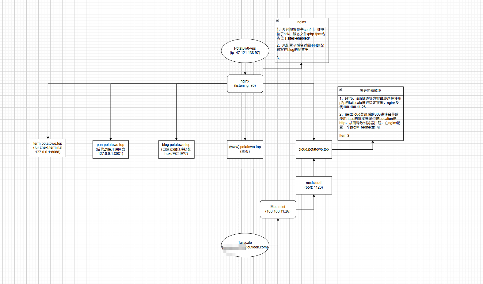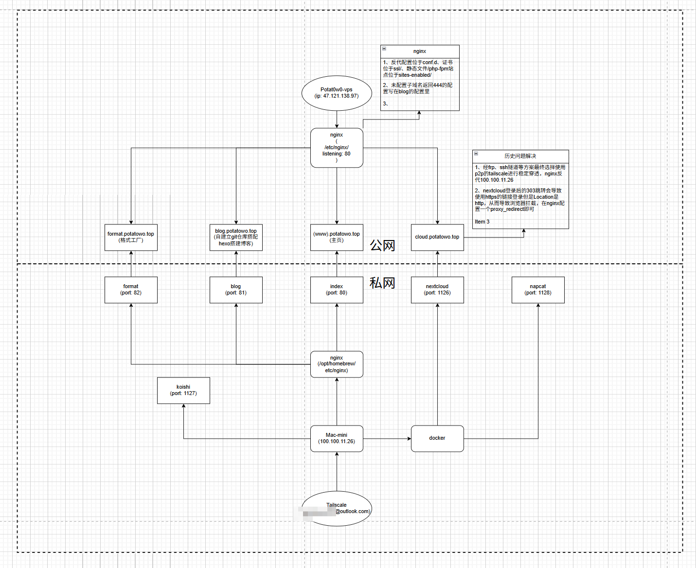 于是我又开始思索。最初的方案是还是和上面nextcloud一样,tailscale作为公网nginx和内网macmini的桥梁,通过反代来获取公网的访问能力。但是下面我又面临了一个新的问题了:以什么作为内网不同应用之间的区分?或者说,公网nginx怎么判断不同的应用url从而来反代?对于诸如docker、java这类应用,它固定会在一个端口跑起来的,这自然好弄。但是对于php-fpm、开放静态文件(比如我的博客就是纯前端)这些情况,公网nginx又该如何去区分它们呢?这个我也整了几个方案: