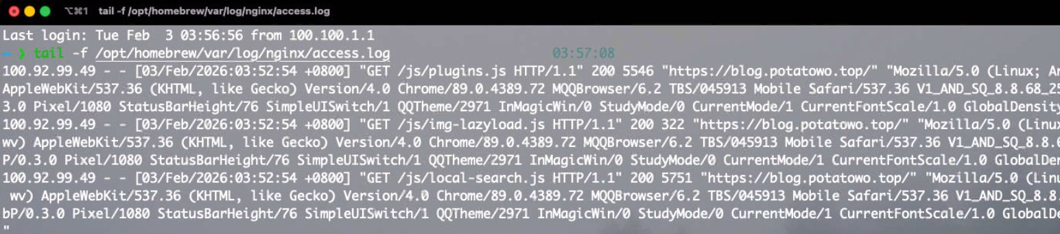 当我看到mac的nginx日志上出现了动静时,那一刻的成就感达到了巅峰。我的所有网站从此摆脱了云服务器厂商的束缚,我也正式拥有了自己的物理“服务器”了。