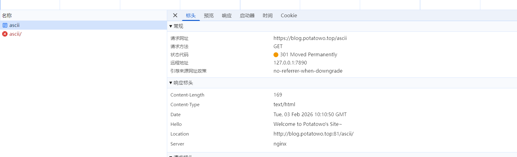 nginx中默认情况下存在一个属性:port_in_redirect on;。当nginx需要给浏览器发送一个301时(比如这里为补全目录ascii/),nginx会告知浏览器应该去哪里,此处博客正运行在81端口,为保证浏览器的信息不丢失,后端nginx就会自动在url中带上:81端口。但是内网nginx并不知道在他的前方还有一个nginx反代,他认为自己是接触浏览器的一线,因此会在Location中自报家门。