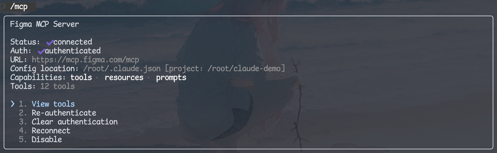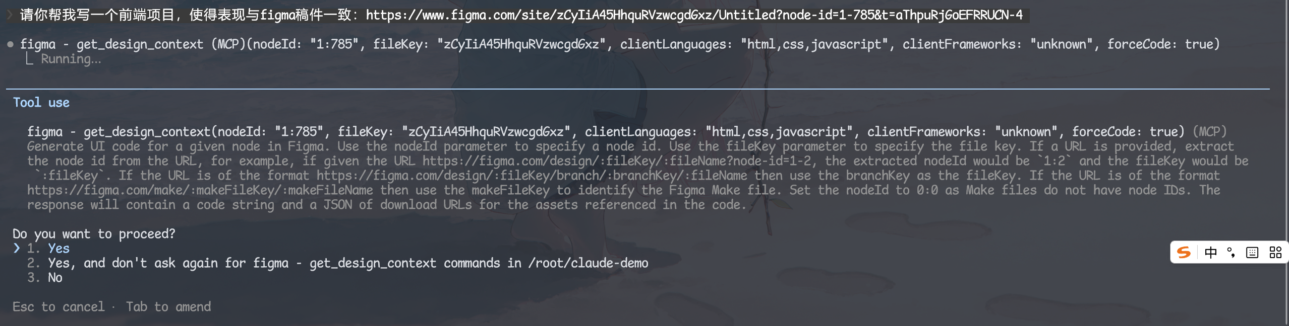 输入/mcp后选中figma的mcp server,第一次使用需要认证,下图是认证后的样子