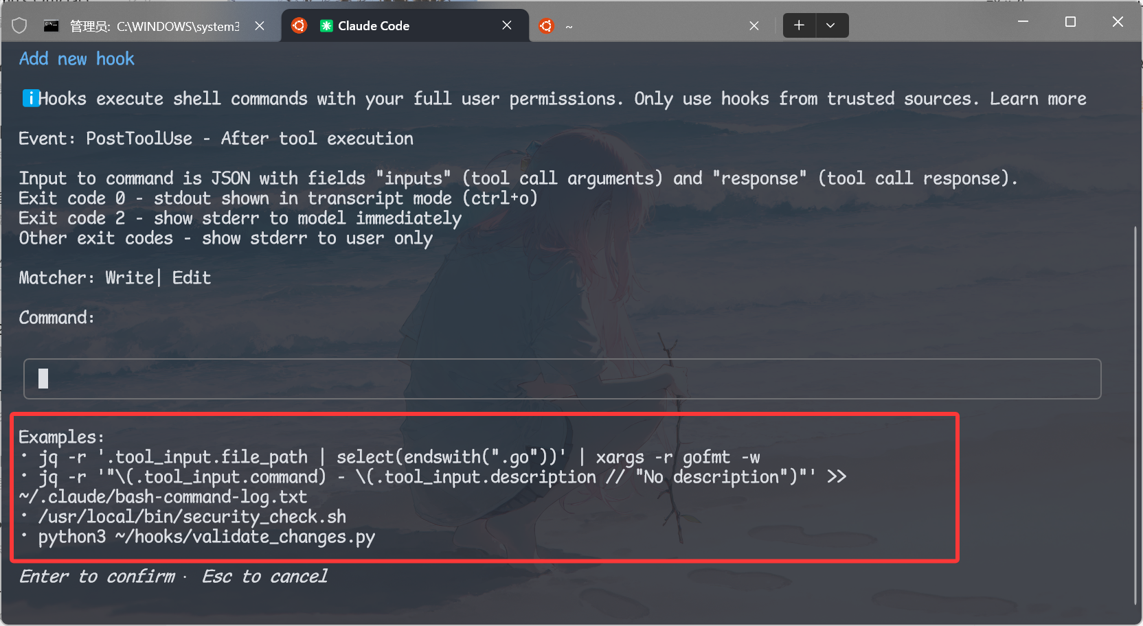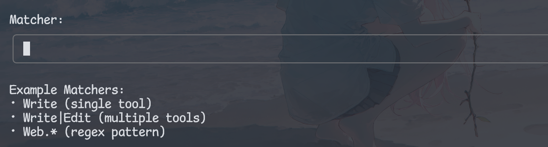 随后选择在什么工具调用后来执行我们的hook,Write(文件写操作),Edit(文件编辑操作)