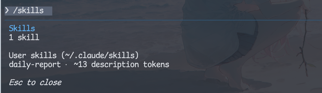 随后重启claude code,输入/skills,可以看到已经成功加载了我们的日报skill了