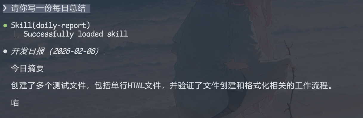 下面有个场景,假设我每天都需要写一份日报,记录当天使用ai开发了哪些功能,做了哪些改动,并且这个总结需要遵循某种格式,我们当然可以将对应的要求直接输入到claude code的输入框中,但是如果每天都复制一下粘贴一下未免过于麻烦了。这种场景就非常适合skills了